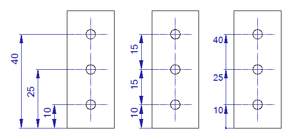 Parallel dimensions are a group of dimensions that all start at the same point. The offset between parallel dimensions is defined in Dimension Attributes. Datum dimensions consist of a line of points, at each of which the dimension defines the total distance from the start point. Serial dimensions are a chain of aligned dimensions that define the distance from point to point.