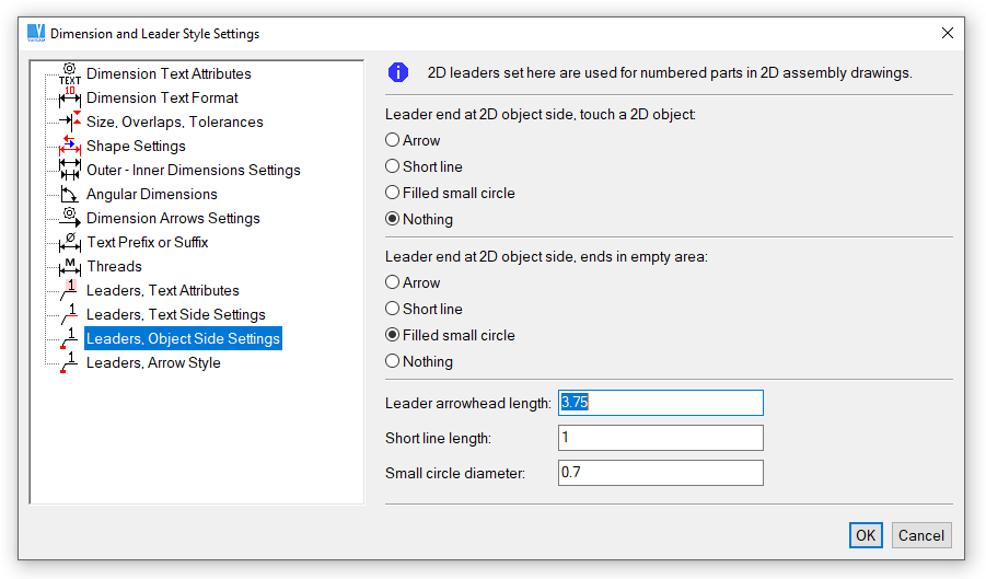 This command creates 2D leaders. If 2D drawing was exported from 3D and if 3D solids have defined item numbers, leader texts (numbers) are assigned automatically to each leader. Otherwise, the leader number is assigned from 1 and each next leader has the number increased.
