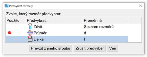 Kromě změny rozměrů můžete také změnit typ vybrané strojní součásti. Rozměry jsou opět předvoleny v dialogovém okně.