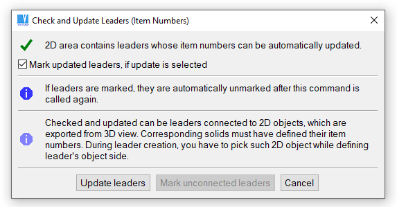 If you change item numbers in 3D solids and if you perform a new export of 3D views into 2D area, item numbers can be checked and updated automatically. If necessary, leaders can be easily deleted from entire 2D drawing or from a selected 2D region. Leaders can be selected as a sub-type of dimension.