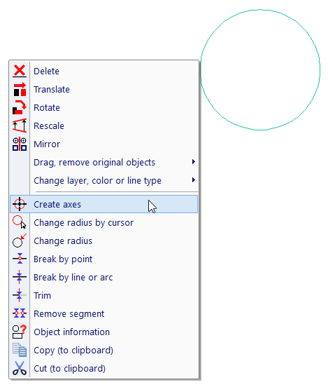 Select a circle or arc, axes are created as four semi-axes in vertical and horizontal direction. Or right-click an arc or circle and select axes creation from pop-up menu.