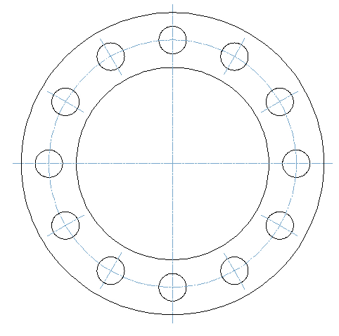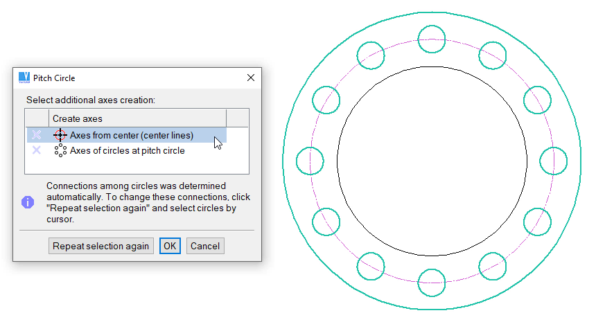 Select an outer circle or inner hole, then select a circle located at pitch circle. Create pitch circle and additional axes. Or, you can right-click outer circle, inner hole or a circle located at pitch circle. Select creation of pitch circle from pop-up menu.