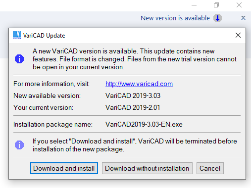 During start, VariCAD checks our server for available updates. If the system detects that you run older version, a message is displayed at the upper right corner of the VariCAD window. Click it, and you can install a new version.