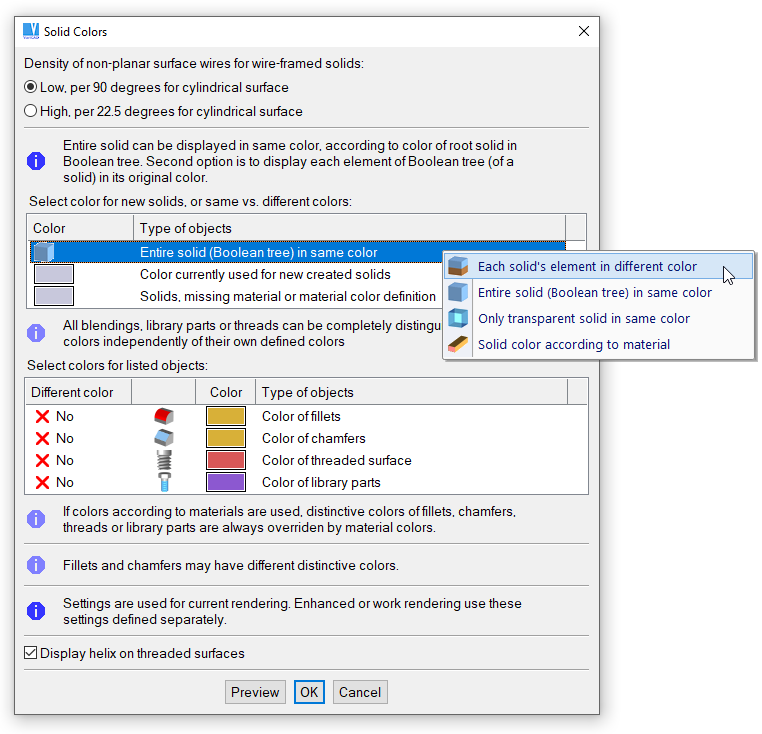 Solid display settings window