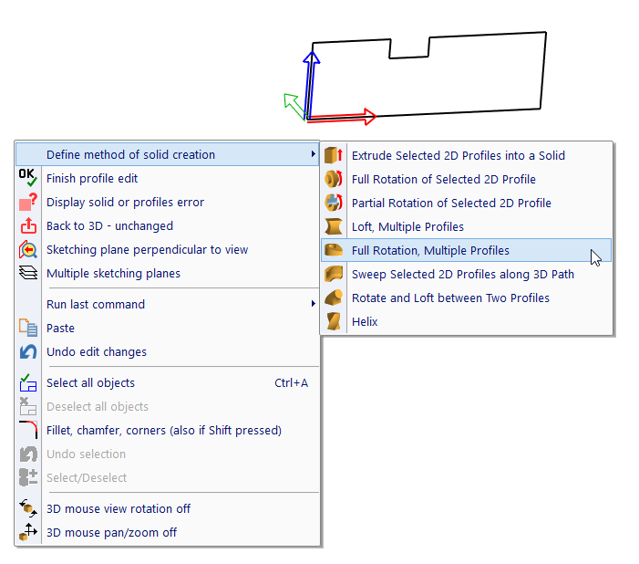 A solid may be created from multiple profiles. Then, each profile is created at a separate sketching plane. To select features related to multiple sketching planes, click XYZ axes of the current sketching plane and select action from menu.
