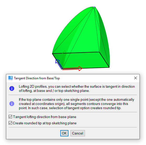 Tangent direction can be selected for lofting from base plane or top plane. This causes the patches edges at base or top plane have normals perpendicular to plane normal. Tangent direction can be selected independently for both base and top plane.