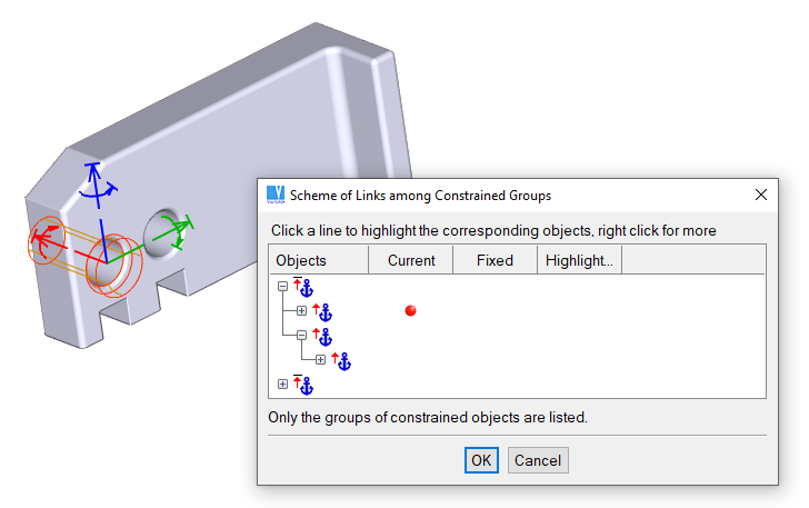 If you want to select anchors (or master solids, or solids the group is constrained to), click a corresponding column in the scheme. Then you can highlight each constraint individually – again because you will see which object will be selected. Or you can select the anchor of each constraint.