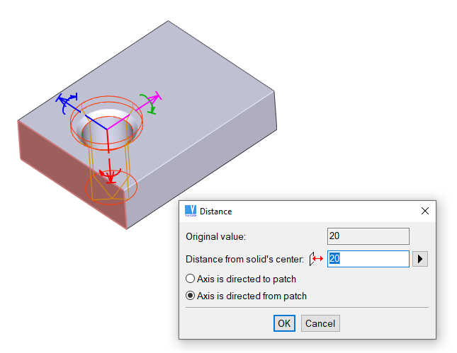 | Distance to solid's insertion point. Constrained object is at a defined distance from the insertion point of a selected object (another solid element). Distance may be either positive or negative (along or against the axis arrow), or zero. This type of the constraint is often used for definition of a distance between holes or other solid elements. |