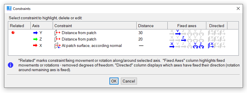Definition of a constraint rewrites all existing constraints whose fix any axis of the object the same way as the new constraint. Fixed movements, fixed rotations or defined directions for the constrained object are displayed in the upper part of the Constraint panel.