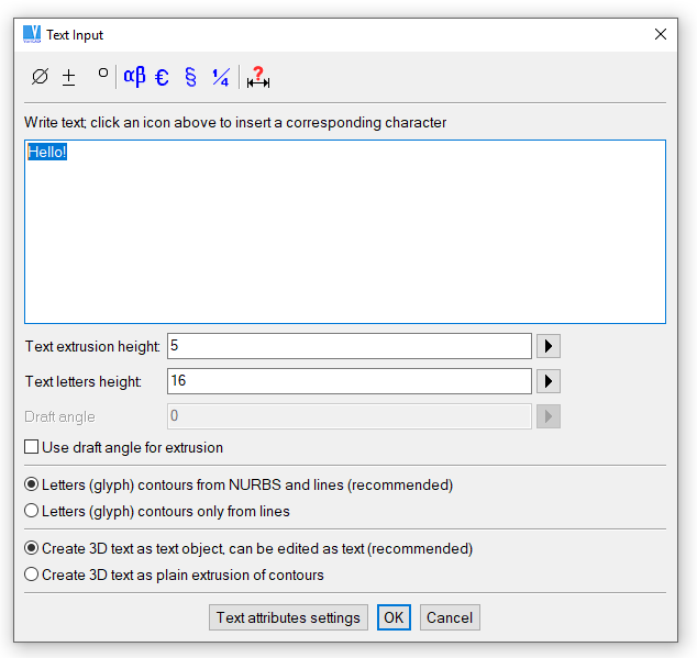 3D texts extruded into space can be defined and edited the same way as 2D texts. You can write text, select text height or text font. For 3D, extrusion height and draft angle is defined. Text font is exploded into 2D contours and these contours are then extruded. Optionally, you can explode fonts into lines and NURBS curves, or only into set of short lines. Also, you can create set of single extruded solids instead of a complex text object. 3D text objects can be added to or cut from any selected solids.