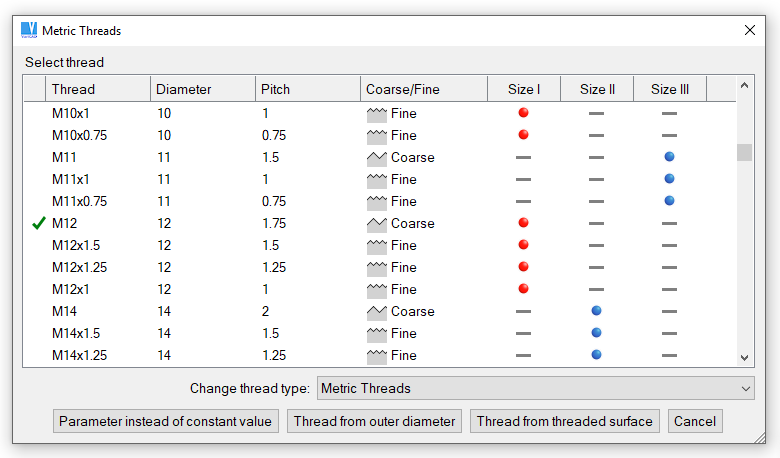 If you create a threaded hole or outer threaded cylinder (a screw), you can select a thread from a list of threads: