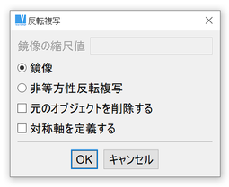 選択したオブジェクトの反転複写をします。既に図面にある線を対称軸として選択するかまたは、2 点を選択して仮の対称軸を作成します。