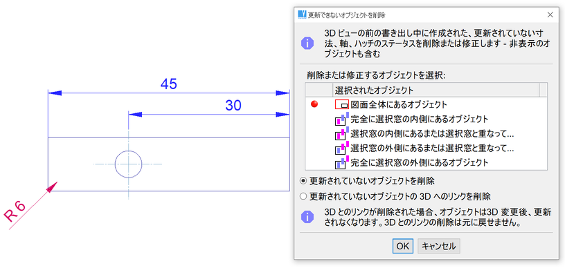 | 選択したオブジェクトの 3D リンクを削除します。このオプションは、2D オブジェクトを選択し、そられが更新できない場合、表示されます。"更新されていないオブジェクトの 3D へのリンクを削除"オプションをクリックし、3D リンクをオフにします。 |