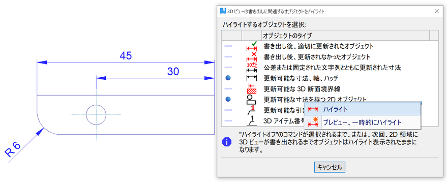 ハイライト表示の選択例 - 3D のビューの書き出しで作成された 2D 線分、曲線、円、円弧