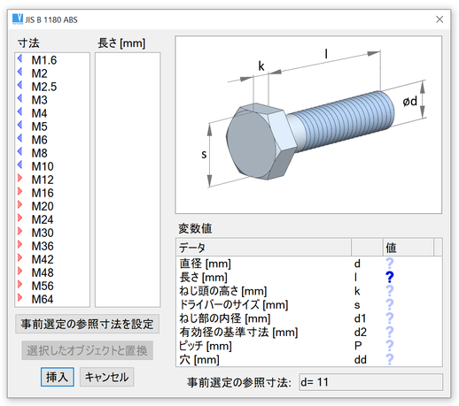 部品メニューから部品の規格と種類(ねじ、座金等)を選択します。六角ボルトのような特定の部品はアイコンメニューから選択できます。寸法を設定する場合、次の選択ができます。
