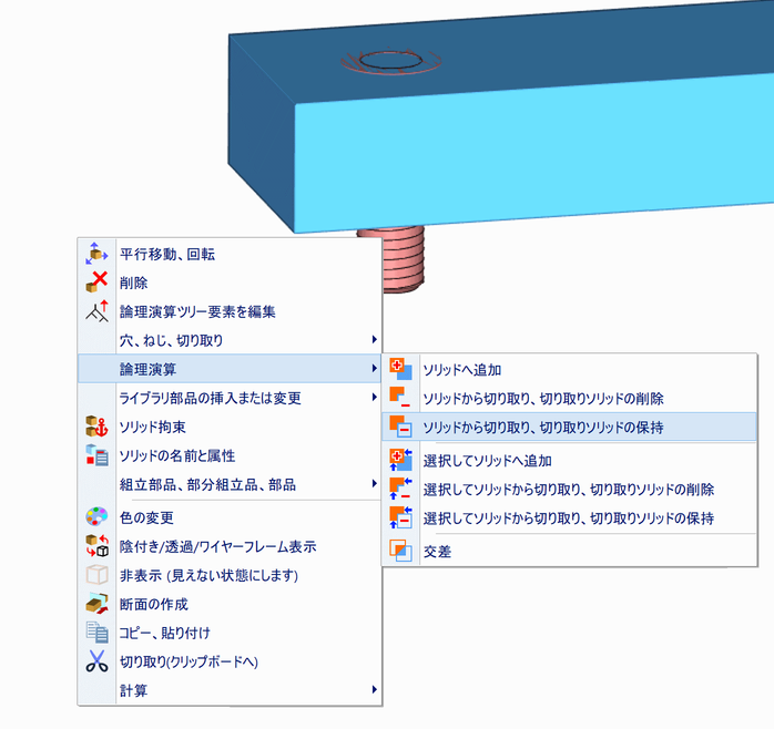 いくつかの機械部品は他のソリッドの切り取りツールとして定義できます。例えば、ねじ穴を作成したい場合、切り取りツールとしてねじを使用し、ねじの円筒部分の正確なネガコピーで、穴を作成できます。"コピーを修正してカット"を選択した場合、ねじの直径よりも大きい直径の穴が作成されます。穴の直径は、ねじの直径に関連付いた規格に従って設定されます。論理演算に関する詳細は、 論理演算 をご覧ください。