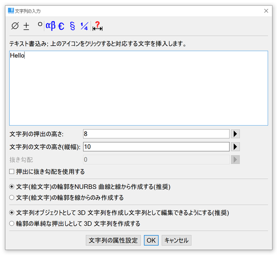 空間に押し出される 3D 文字列は、2D 文字列と同じ様に定義、編集できます。文字列を入力し、文字列の高さまたは文字列フォントを選択できます。3D では押出しの高さと抜き勾配を定義します。文字列フォントは 2D の輪郭に分解され、これらの輪郭が押し出されます。オプションで、線と NURBS 曲線に輪郭を分解したり、短線のみのセットに分解できます。また、複雑な文字列オブジェクトの代わりに、単一のソリッドのセットを押出して作成できます。3D 文字列オブジェクトは選択したソリッドに追加したり削除できます。