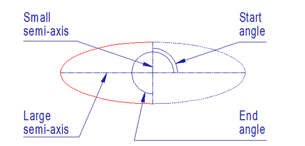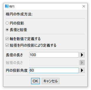 楕円は長軸と短軸の設定もしくは円の投影により作成します。楕円の円弧を作成する場合、開始角度と終了角度を定めます。両方の角度を同じにすると楕円全体が作成できます。同じ位置でスペースバーを 2 回押すと簡単に同じ角度を指定できます。1 つ目の円弧の角度を入力し、カーソルを動かさないで、 もう一度、2 つ目の角度を入力します。
