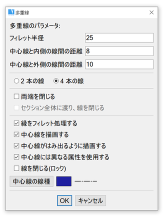 多重線は 1 つの線として動く平行線のグループになります。多重線を作成する前に、線の数、中心からの線の距離、フィレット処理のようなパラメータを設定できます。