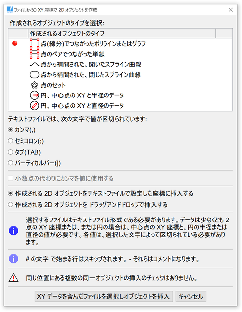 様々なタイプの 2D オブジェクトを XY 座標をテキストファイルから読み込んで定義できます。下図参照。2D オブジェクトとその他のプロパティを選択した後、ファイル名を選択します。ファイルから読み込んだ値は新規 2D オブジェクトとして挿入できます。