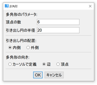 多角形はすべての辺の長さが同じオブジェクトです。多角形は引き出し円の半径を設定し、引き出し円の内側または外側に配置でき、辺の数(頂点)や頂点の位置を定めることができます。