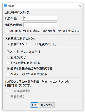 シャフトまたは他の対称 2D オブジェクトを作成します。シャフトを作成する前に、座標画面、丸み付け、面取り、円錐か円筒部品の作成かどうかを定めます。シャフトを描くとき、座標は dX、dY のように表示されます。始めの軸点から測定するか(始点からの総距離)最後の点から測定するか(作成された線分の距離)を選択できます。