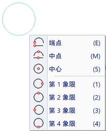 ほとんどの 2D オブジェクトは XY 座標形式で幾何学的な入力が必要になります。VariCAD はオブジェクトの選択が簡単です。オブジェクト上の 1 点を選択する場合、カーソルをオブジェクト上で動かすと、ハイライトされます。オブジェクト上をクリックすると、オブジェクトに最も近い点が選択されます。カーソルを端点や中点のようなスナップ点に近づけると、記号がカーソル横に表示されます。この記号が表示されているときにクリックすると点が選択されます。次の文字がスナップ点を表します: