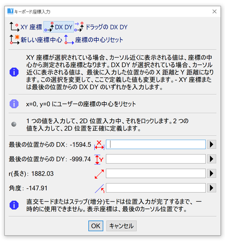 2 つの値を入力した場合、入力は正確に設定されます。距離と角度等の位置入力で固定の座標入力の組み合わせができます。