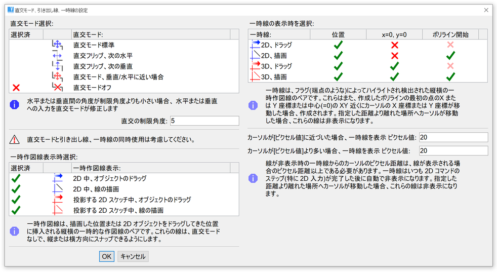 スケッチまたは 2D モードでこれらの一時作図線のオン、オフをするには、コマンド“CFG”を実行するか、 直交モード、一時作図線 を選択してください。