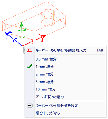 ソリッドのドラッグ例。右クリック後、ポップアップメニューに増分オプションが表示されます。