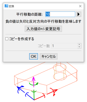 - 軸(矢印)の外側部分をクリックします。次に、矢印方向に平行移動する距離を定めます。また、この方向に複数のコピーを作成することもできます。