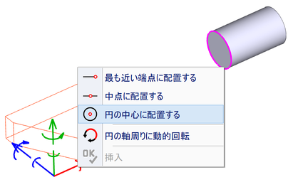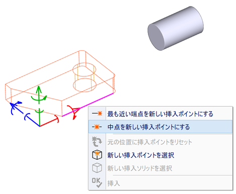 3D 空間内でソリッドを配置する場合、挿入ポイントによって配置します。ソリッドの作成中、各ソリッドの挿入ポイントを定めます。ソリッドを結合する場合、他のオブジェクトが追加されるオブジェクト(ルーツソリッド)の点が初期設定の挿入ポイントになります。複数のオブジェクトを挿入する場合、最初に選択したオブジェクトの挿入ポイントが使用されます。また、いつでも挿入ポイントの位置を再設定できます。