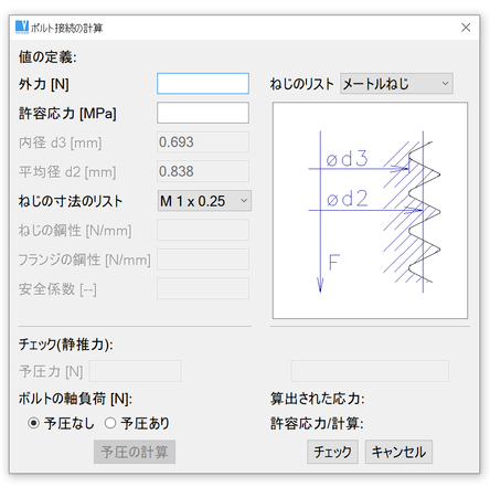 部品計算はオブジェクトメニュー >計算からできます。ISO 単位(mm、N、MPa 等)を計算に使用します。次のような機械部品を計算できます。