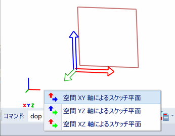 軸の選択 このポップアップメニューは 3D 空間に何もない状態の場合に表示されます。メニューアイテムに対応するスケッチ平面がハイライト表示されます。平面の軸は世界軸ではなく、スケッチ平面の軸として表示されます。