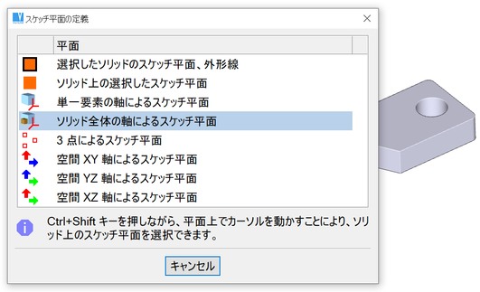 3D 空間にソリッドがある場合、このダイアログパネルが表示されます。スケッチ平面は、ソリッドの平面の表面またはソリッドの軸上で選択できます。