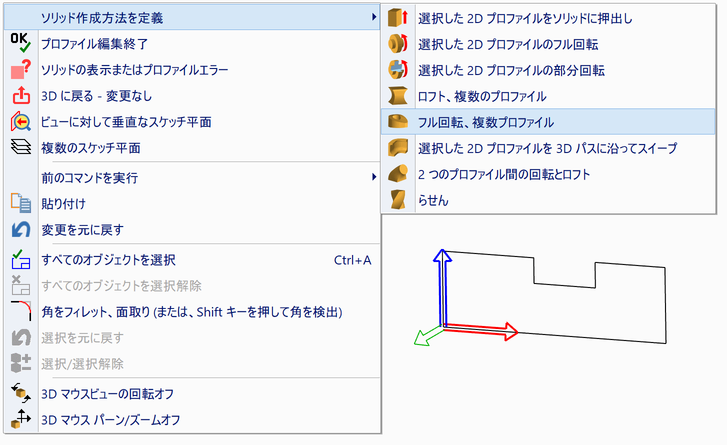 X 軸周りに回転させる複数の面を定義して、ソリッドを作成することができます。最初に、回転したいプロファイルを作成します。何もない位置で右クリックし、ソリッドの作成方法を選択します。