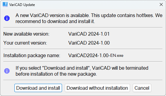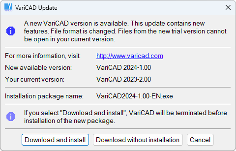 When VariCAD is started, it checks if a new version of VariCAD is available. The result is displayed in the upper right corner of the VariCAD window. Click on the information about the new version to install it.