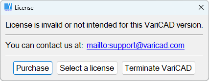 The license is incorrect or not intended for this version of VariCAD. You do not have a paid One Year Upgrade for this update.