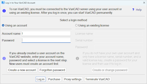 When you start VariCAD for the first time, you will be prompted to log in. You can log in using an account or a license. If you only have one VariCAD license, log in with an account. If you own multiple licenses, select from the following options: