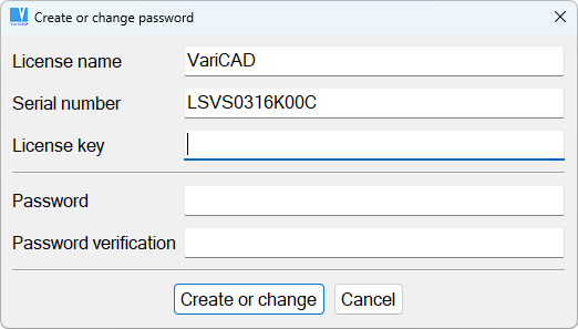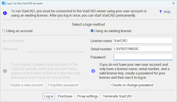 Logging in with a license requires entering the License Name, Serial Number and License Key. You can find this information on your personal page at varicad.com or you will receive it by mail after purchasing a VariCAD license. After entering these data and password, enter this password in the previous form and log in.