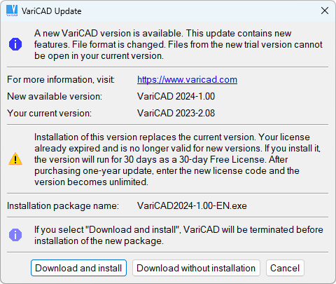 If you install a new version of VariCAD without a valid One Year Upgrade, VariCAD will not start. In this case, you need to purchase an annual upgrade or go back to the old version of VariCAD.
