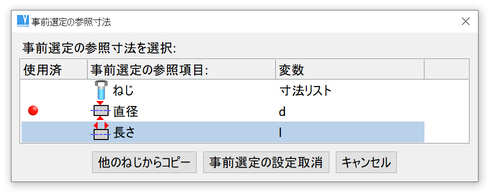- リストから基本寸法を選択しその後、他の寸法もリストから選択します。例えば、ねじを定義する場合、ボルトの直径を選択します。その後、選択した直径によって、長さのリストが表示され、その中から選択します。