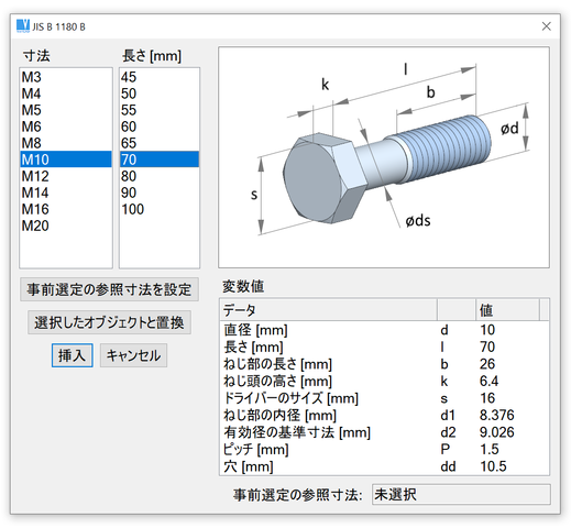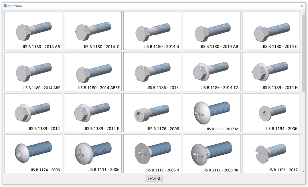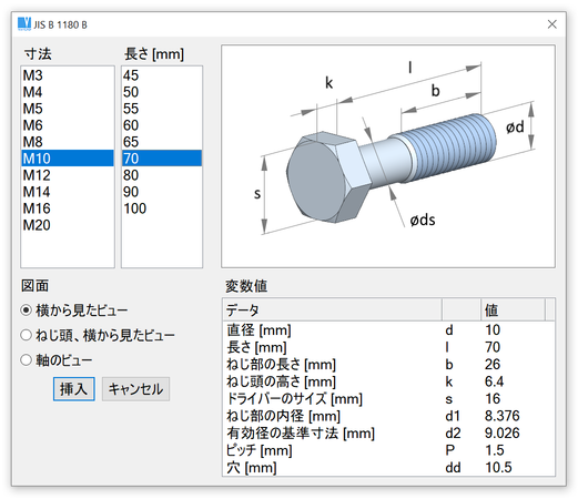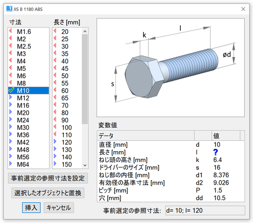 部品メニューから部品の規格と種類(ねじ、座金等)を選択します。六角ボルトのような特定の部品はアイコンメニューから選択できます。寸法を設定する場合、次の選択ができます。