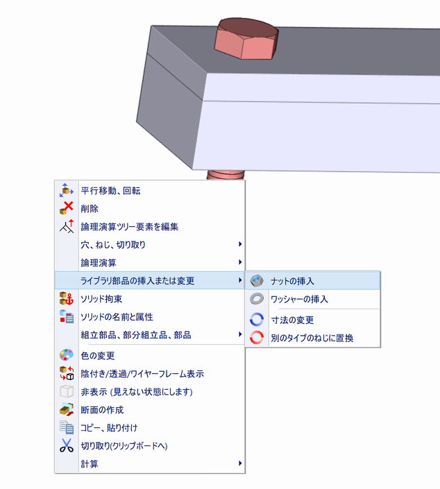 - ねじ穴の表面を右クリックした場合 - ねじの挿入
