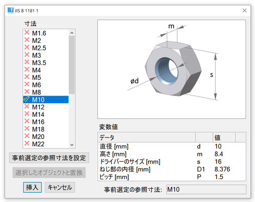 - 寸法選択パネルの画像サイズ(M10、M12 などのサイズの選択)