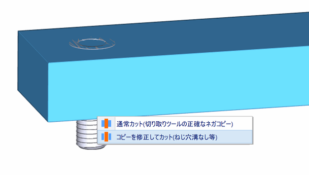 いくつかの機械部品は他のソリッドの切り取りツールとして定義できます。例えば、ねじ穴を作成したい場合、切り取りツールとしてねじを使用し、ねじの円筒部分の正確なネガコピーで、穴を作成できます。"コピーを修正してカット"を選択した場合、ねじの直径よりも大きい直径の穴が作成されます。穴の直径は、ねじの直径に関連付いた規格に従って設定されます。論理演算に関する詳細は、 論理演算 をご覧ください。