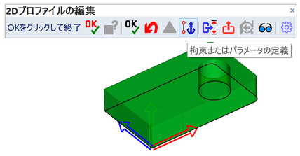 2D 作成プロファイルの拘束とパラメータで作業する場合、まず、編集するソリッドを選択します。次に、編集ツールバー内の対応するアイコンをクリックします。- 2D 編集モードはプロファイル拘束モードに切り替えられます。同様に、拘束モードから 2D 編集モードに切り替える場合は、拘束ツールバー内のアイコンをクリックします。