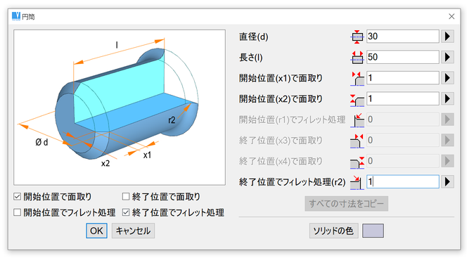 パネルに表示される画像は現在の設定オプションに従って変更されます。例えば、円筒ソリッドのオプションで面取りやフィレット処理を選択できます。これらのオプションの変更で、画像は面取り有り/無し等で表示されます。