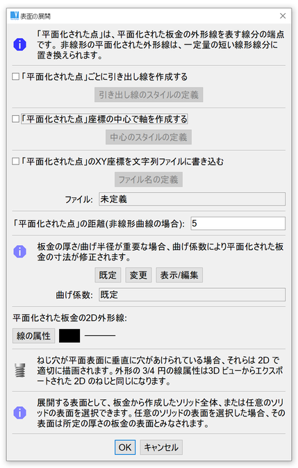 - 2D 展開で座標の原点と引き出し線を作成するかどうかを設定します。