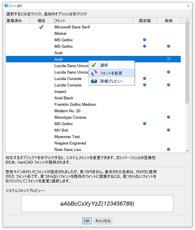VariCAD で使用される全ての文字列オブジェクトは Unicode でエンコードされています。しかし、文字フォントを選択する場合、いくつかの制限があります。VariCAD は次の2つのフォントタイプで動作します: